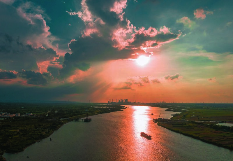 傍晚時分,淮河被漫天晚霞染成金紅畫卷,色彩層次豐富而迷人。余暉灑落在淮河水面上,波光粼粼,像是無數(shù)顆星星在閃爍跳躍。河水悠悠流淌,倒映著城市與自然的和諧共生,構(gòu)成了一幅美輪美奐的淮河晚霞圖。
