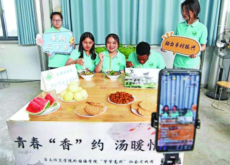 “你們知道淮南的牛肉湯里都有哪些好吃的食材嗎?”“This beef soup is the taste of Huainan's history!”在閃沖村百年牛肉湯店,三名留學(xué)生正通過“尋味八公山”抖音號開展雙語直播。專業(yè)主播與留學(xué)生搭檔解說,用中文和英文向直播間的觀眾進行熱情推介,讓八公山區(qū)的非遺美食走向更廣闊的市場。留學(xué)生們還在自己的FACEBOOK上進行同步直播,綠豆圓子、桃子、西瓜,各種各樣的特色農(nóng)產(chǎn)品都通過直播間展示給各個國家的朋友們。