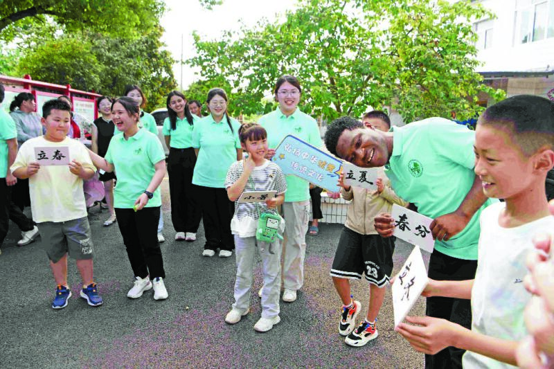 (記者 )“Summer夏天!Autumn秋天!跟我一起大聲讀!”“把‘春雨驚春清谷天,夏滿芒夏暑相連……’這首二十四節(jié)氣歌里的季節(jié)都用英語來說,你們敢不敢挑戰(zhàn)一下呢!”近日,八公山區(qū)山王鎮(zhèn)林場村村部教室里傳來清脆響亮的誦讀聲,淮南師范學(xué)院三位留學(xué)生科塔、阮玉梅和美煜正帶著村里的留守兒童們“玩”得不亦樂乎。