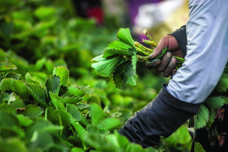 只見她們用指尖輕巧地?fù)荛_層層綠葉,精準(zhǔn)地掐下邊緣泛黃、略顯疲態(tài)的老葉。葉片脫離莖稈時(shí)發(fā)出細(xì)微的脆響,像是一聲聲輕嘆。摘下的老葉蜷曲著堆在田埂旁,漸漸在陽(yáng)光下褪去最后一絲綠意。新生的嫩葉舒展開來,在微風(fēng)中輕輕搖曳,仿佛整片草莓田都因這場(chǎng)“修剪”而煥發(fā)了活力。