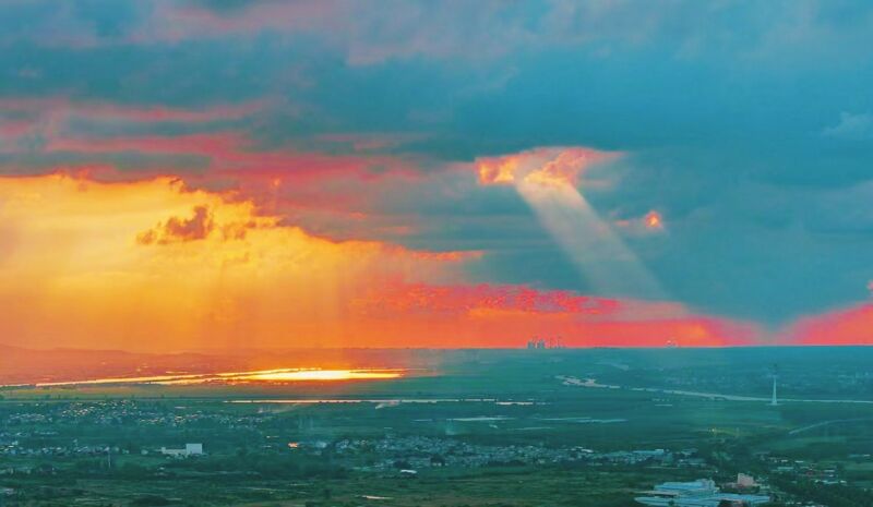 盛夏的淮南,一場光之魔術(shù)正在上演。熾烈的陽光穿透層云,化作萬丈光瀑傾瀉而下——這便是神奇的丁達(dá)爾效應(yīng)。光束如探照燈般,為舜耕山的蔥郁山脊鍍上流動的金邊。在人民公園的湖面,光柱在云間穿梭,編織出夢幻的七彩云霞;浩渺的淮河之上,光路鋪陳,水面碎金躍動,仿佛流淌著液態(tài)的綢緞。熟悉的舜耕山、人民公園、淮河,此刻皆被這迷離的光影賦予了超現(xiàn)實的色彩,宛如墜入一場盛大而靜謐的光之詩篇。