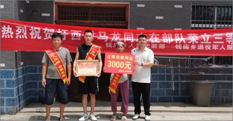 矢志建功在軍營(yíng),立功喜報(bào)家中送。8月4日,鳳臺(tái)縣錢(qián)廟鄉(xiāng)黨委、政府及退役軍人服務(wù)站組成慰問(wèn)組,專程前往該鄉(xiāng)圩西村,為榮立三等功的現(xiàn)役軍人馬龍家庭送上立功喜報(bào)、慰問(wèn)金及家鄉(xiāng)人民的祝福與感謝,讓軍人軍屬共享這份榮耀和喜悅。