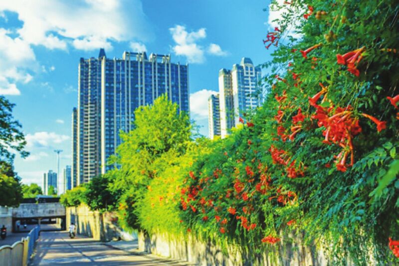 當(dāng)下,我市淮河大道立交橋東側(cè)的南北下沉式非機(jī)動(dòng)車(chē)過(guò)道旁,長(zhǎng)約30米的墻壁上開(kāi)滿(mǎn)了凌霄花,形成一道美麗的花墻;鸺t的花朵在烈日下熱情綻放,花開(kāi)如瀑,花藤隨風(fēng)搖曳,成為酷暑盛夏一抹亮麗的風(fēng)景。