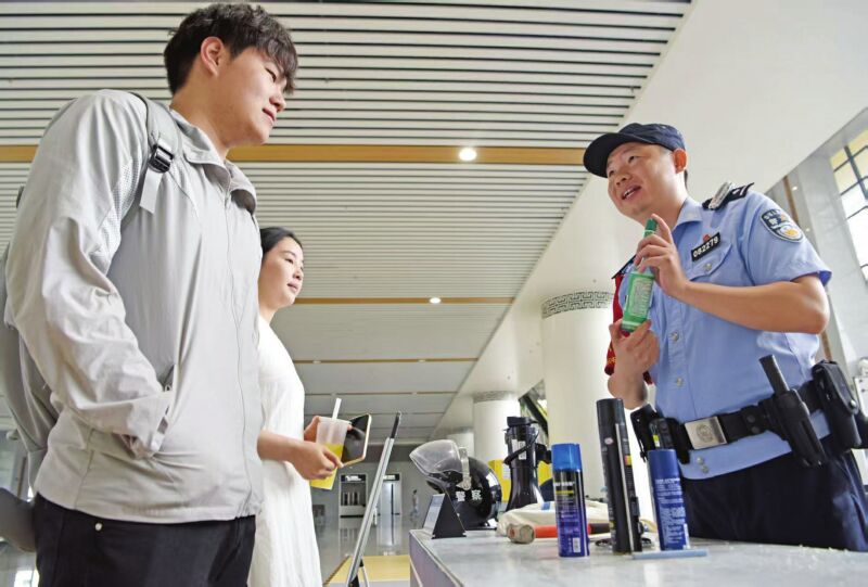 八月十三日,淮南南站派出所民警向出行旅客介紹違禁物品的危害性。伴隨著暑運(yùn)學(xué)生流、探親流、旅游流返程高峰到來,淮南南站派出所加強(qiáng)安全宣傳教育,織密鐵路安全防護(hù)網(wǎng),為旅客平安出行和鐵路運(yùn)輸安全保駕護(hù)航。