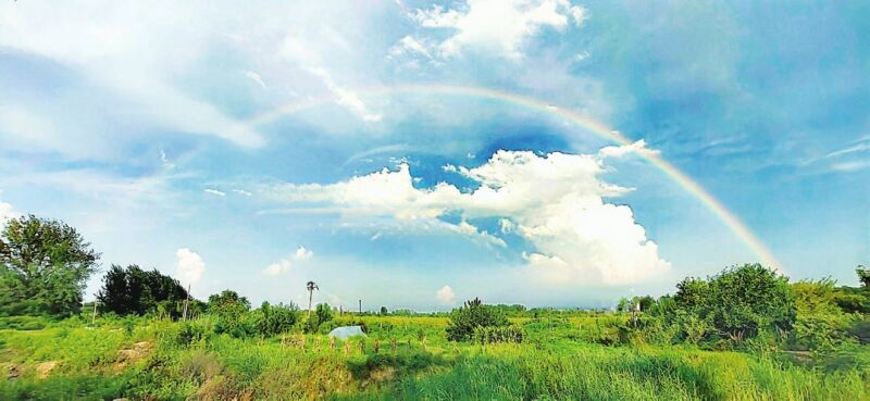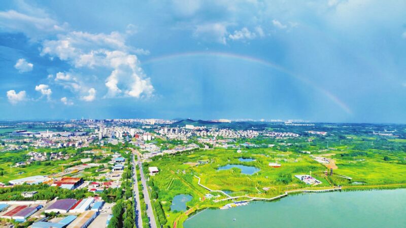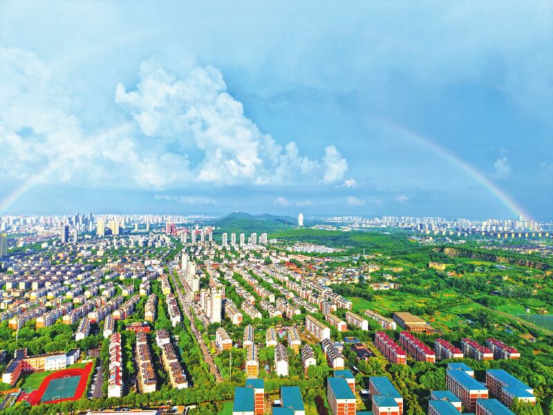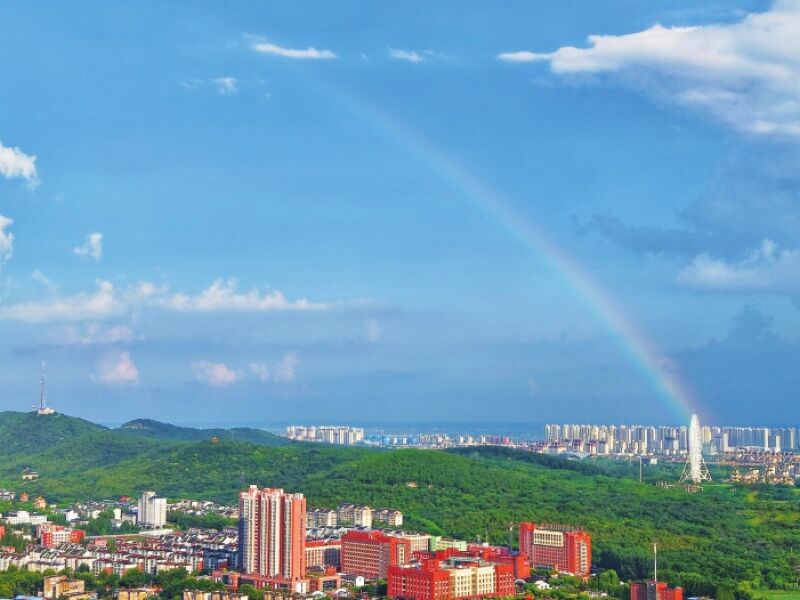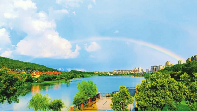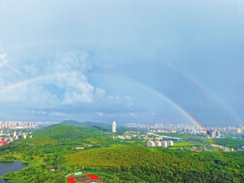 驟雨初歇,淮南的天空被洗練得格外澄澈。倏忽間,兩道瑰麗的虹橋拔地而起,橫跨蒼翠的舜耕山麓,一道沒入淮南高新區(qū),一道垂落田家庵老城區(qū),七色流轉(zhuǎn),盡顯靈動好看。