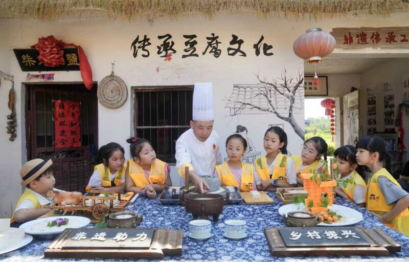 8月22日,在壽縣雙橋鎮(zhèn)大郢村,壽州豆腐宴非遺代表性傳承人張士宏給來研學(xué)的小朋友講解豆腐宴傳統(tǒng)制作技藝。