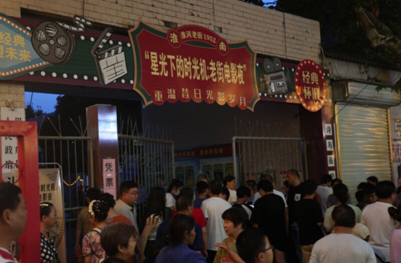 天公宜作美,夜色也宜人。連日來(lái)的高溫,在傍晚悄然隱去。一時(shí)間,淮河老街1952街區(qū)游人如織,由田家庵區(qū)委宣傳部舉辦的“星光下的時(shí)光機(jī):老街電影夜”活動(dòng)恰在此時(shí)開(kāi)幕。