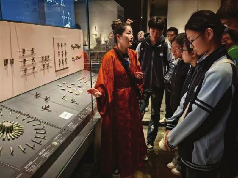 在安徽楚文化博物館,學(xué)生們被展柜中斑駁的青銅器深深吸引!斑@是楚國(guó)時(shí)期的劍,劍身的紋路還能看清鑄造痕跡!”隨著講解員的介紹,有學(xué)生忍不住伸手輕觸展柜玻璃,仿佛想透過冰涼的屏障,觸摸千年前的鑄劍火光。另一側(cè)的壽縣古城墻下,學(xué)生們指尖撫過磚石上的青苔感嘆:“課本里說‘城郭堅(jiān)厚,易守難攻’,親眼看到才懂這城墻背后藏著多少歷史故事!