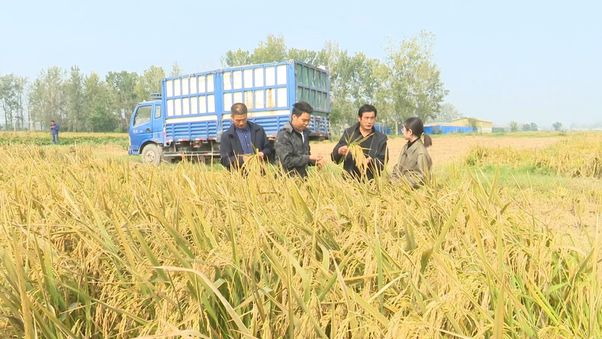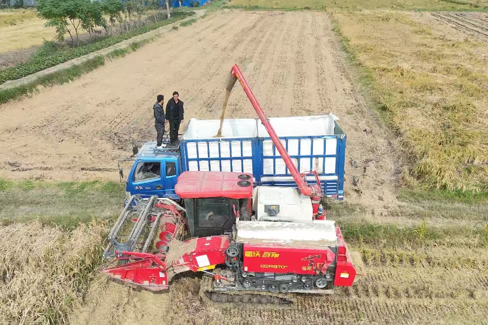 在合作社托管的一片金色稻田里,記者看到,現(xiàn)場(chǎng)機(jī)聲隆隆,一輛輛收割機(jī)來(lái)回穿梭,呈現(xiàn)一派繁忙的秋收?qǐng)鼍。停在田邊的運(yùn)糧車(chē)待裝滿(mǎn)后,將稻谷運(yùn)往合作社倉(cāng)庫(kù)進(jìn)行烘干。
