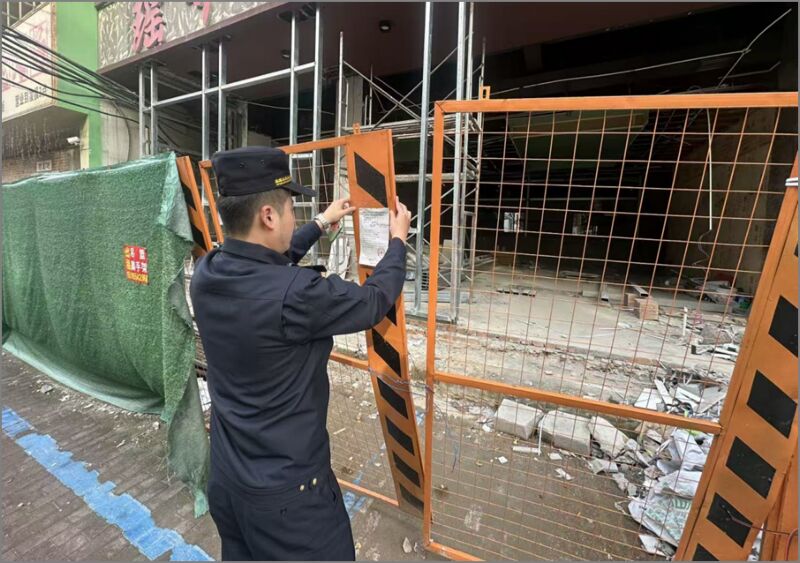 發(fā)現(xiàn)該情況后,執(zhí)法人員立即現(xiàn)場制止施工,并向該店負責人現(xiàn)場宣講違建相關法律法規(guī),明確指出其行為的違法性質及潛在安全風險。隨后,執(zhí)法人員嚴格按照程序,現(xiàn)場完成證據固定,并依法下達責令整改通知書,要求其按期自行拆除、恢復原狀,否則將依法強制拆除。