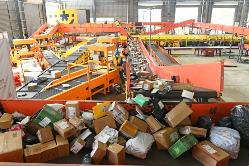 11月11日,淮南市快遞物流產(chǎn)業(yè)園內(nèi),韻達(dá)快遞企業(yè)工人及時(shí)分揀處理“雙11”快遞。又是一年“雙11”,各地電商和物流企業(yè)工作人員加班加點(diǎn),忙著銷(xiāo)售、發(fā)貨,一派繁忙景象。