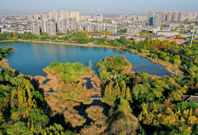 一場(chǎng)寒流過(guò)后,我市由秋入冬。11月18日,俯瞰初冬的老龍眼濕地,周邊山林草木漸漸由翠綠色演變?yōu)榧t黃,與湛藍(lán)的湖水構(gòu)成一幅美麗圖畫。