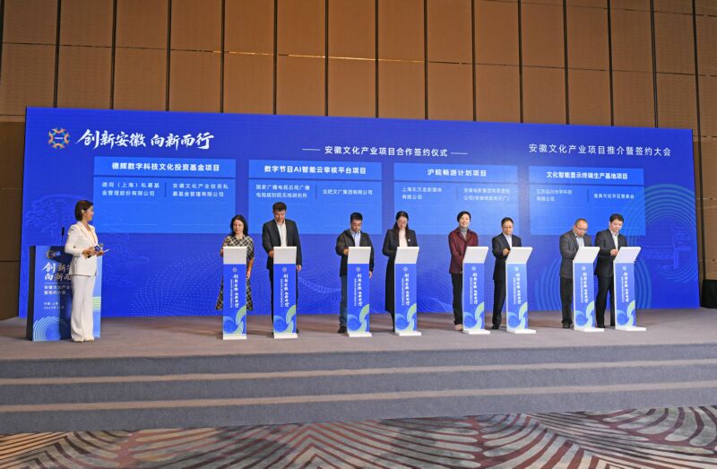 安徽文化產(chǎn)業(yè)項(xiàng)目推介暨簽約大會(huì)現(xiàn)場(chǎng),總投資1.45億元的文化智能顯示終端生產(chǎn)基地項(xiàng)目成功簽約。
