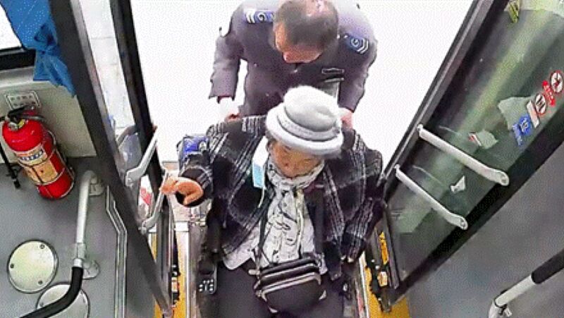 由于輪椅較重,上下車(chē)又存在一定坡度,整個(gè)過(guò)程并不輕松。王師傅細(xì)心地將輪椅往旁邊靠,尋找最佳位置,口中不停說(shuō)著“好的好的”“你別急”“別急別急”,以緩解大媽的緊張情緒。大媽則感動(dòng)地表示:“哎呦,師傅怎么這么好,太感謝了!”