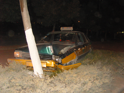 圖為無(wú)牌出租車(chē)撞在綠化帶內(nèi)的樹(shù)木上