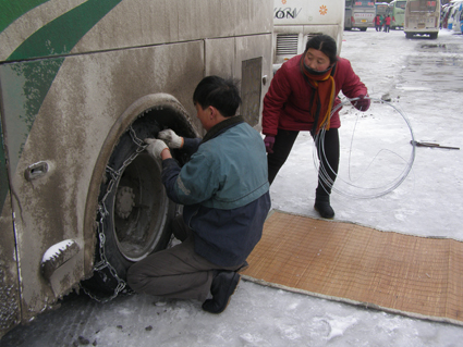 圖為長(zhǎng)途客車司機(jī)正在安裝防滑鏈。