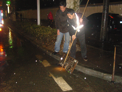 記者到達(dá)現(xiàn)場時(shí),看見市長公開辦、市建委、交警支隊(duì)田家庵一大隊(duì)、市政管理處等多部門主要負(fù)責(zé)人,正在冒著嚴(yán)寒和雨雪,積極商討處理措施。由于陳洞路竣工不久,還沒有交付市政管理處使用,又無法聯(lián)系施工方,只能調(diào)動(dòng)市政管理處排水設(shè)施管理所,讓他們負(fù)責(zé)疏通該路段的下水管道,排水設(shè)施管理所楊友學(xué)所長隨即組織6名員工,出動(dòng)高壓清洗車一臺(tái),冒著刺骨的寒風(fēng)和雨雪,趕赴現(xiàn)場。經(jīng)過近三個(gè)小時(shí)的工作,徹底疏通了堵塞的下水管道(如圖二),清除了路面積水。截至記者發(fā)稿,陳洞路道路積水已經(jīng)全面清除,徹底消除了氣溫驟降道路結(jié)冰的交通安全隱患。