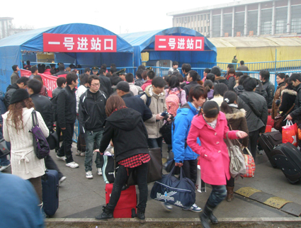 記者沿著火車(chē)站外廣場(chǎng)上設(shè)立的臨時(shí)通道,進(jìn)入候車(chē)大廳,看到僅候車(chē)大廳的門(mén)口就被人群堵了個(gè)水泄不通,許多市民急著趕火車(chē),一個(gè)勁的向檢票口擠。記者好不容易擠進(jìn)了候車(chē)室,發(fā)現(xiàn)自己已經(jīng)開(kāi)始出汗了,再往前走一步都很困難。武警官兵、公安民警及火車(chē)站的工作人員也散落在大廳各個(gè)地方維持秩序,他們有的為市民解答發(fā)車(chē)時(shí)間,有的幫助市民搬運(yùn)行李,檢票口處的武警官兵更是用身體阻擋蜂擁而來(lái)的人潮,有的士兵連嗓子都喊啞了。