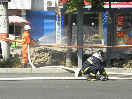 了解到事故發(fā)生的情況后,搶險人員趕緊將事情上報公司領導,并啟動了緊急預案,他們首先用緊急隔離帶將這一片隔離,并與公安、消防、建委、安監(jiān)等部門進行了聯(lián)系。很快,這些部門人員陸續(xù)趕到,交警部門現(xiàn)場指揮,疏導車輛、行人,并再次用隔離帶將這一片進行封鎖,以防車輛、行人發(fā)生意外。消防部門則動用了消防水帶,噴向正四處飄散的泄漏煤氣,以將安全隱患減少到最低點,各部門各司其責,分工合作。時間一分一秒地過去,經(jīng)過3個多小時的緊張搶修,煤氣公司搶修人員終于用特殊工具將挖斷的煤氣管道處理完畢。