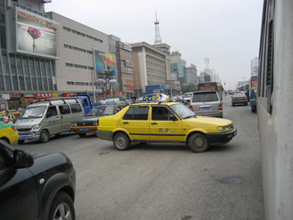 圖為這輛出租車不顧車流人流,就地亂調(diào)頭,導(dǎo)致過往車輛受阻。