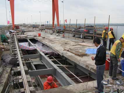 據(jù)了解,此次維修的亮點之一,就是公路橋面用鋼筋混凝土組合結構代替了原來的鋼筋混凝土,這種組合結構將解決從公路橋面向下層鐵路橋面掉落螺絲釘、螺帽、石子等雜物的問題;此外,這種組合結構的受力可均勻分布,因而承重能力更好,在理想狀態(tài)下,設計壽命可達幾十年。公路路面采用薄層瀝青混凝土路面,厚度只有4公分,比原來的路面更薄,“路面并非越厚越好”,現(xiàn)場施工負責人告訴記者,這種薄層瀝青混凝土路面是一種新工藝,它的耐磨性要好于以前。此外,此次大橋維修也更換了原有的伸縮縫,伸縮縫位于大橋混凝土面板之間,起到連接、減震等作用。而原有的伸縮縫存在的缺陷在于,只能允許橋面板之間前后錯位。新使用的伸縮縫,采用了新工藝,屬于國際專利產品,可以承受橋面板上下、左右、前后三個方向的錯位,因而連接、減震等作用更好。