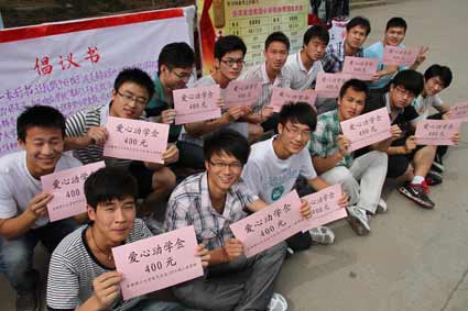 6月16日下午,在校園的林蔭道上,安徽理工大學(xué)電氣學(xué)院的大學(xué)生們正在忙碌著!巴瑢W(xué)們,請為山區(qū)的孩子獻上一份愛心吧!彪S著時間的推移,他們的眼前堆起了一摞摞內(nèi)容豐富的課外書籍,也募捐了整整5600元的慈善款,由衷的笑容映上了他們的臉頰(如圖)。大學(xué)生志愿者孫立偉同學(xué)說:“去年暑假,我們?nèi)サ脑牢骺h溫泉輔導(dǎo)小學(xué)和步文友誼希望小學(xué),認(rèn)識了那里的孩子后,我們一直記掛著他們。今年暑假,我們又要去那支教了,希望我們募捐的錢物能改善他們的生活,豐富他們的課余生活。”
