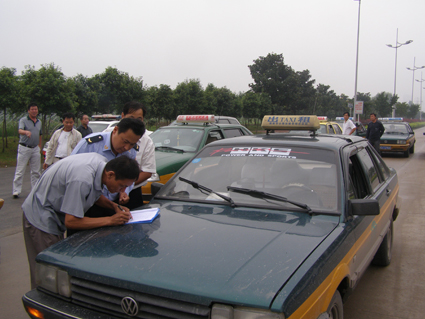 隨后參與演練的出租車陸續(xù)趕到,經(jīng)統(tǒng)計下午3時40分,有20輛出租車趕往點驗處;下午4時,有35輛出租車趕到;下午4時10分,有52輛出租車趕到;截止到下午5時,共有58輛出租車趕到,占參與演練出租車總數(shù)的95%。