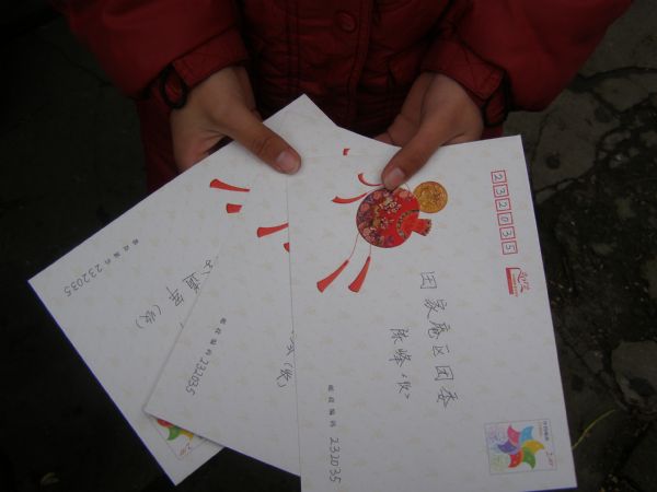 等到梅梅寫好了那一封封新年賀卡,記者一一翻閱信封上這些人的名字:九龍崗派出所的李道軍,淮南市紅十字會(huì)的陳玉琴,田家庵區(qū)團(tuán)委的陳峰,九龍崗鎮(zhèn)副鎮(zhèn)長劉慶華、九龍崗鎮(zhèn)民政辦主任周紅……梅梅把這些曾經(jīng)幫助她的人的名字深深記在了心里,正一筆一劃地表達(dá)著自己的心聲。禮輕情意重,賀卡雖小,但卻承載著祖孫倆最誠摯的感激。