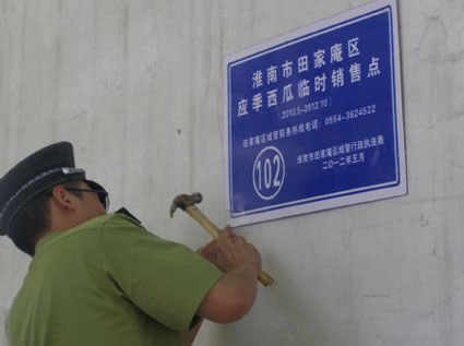 精心規(guī)劃的2012年“西瓜地圖”已經(jīng)從城區(qū)地圖上落實(shí)到了淮南市田家庵區(qū)的大街小巷;截止到5月15日上午,淮南市田家庵區(qū)的109個(gè)西瓜臨時(shí)銷售點(diǎn)全部掛牌完畢,進(jìn)城賣瓜的瓜農(nóng)們一看到那張藍(lán)底白字的“應(yīng)季西瓜臨時(shí)銷售點(diǎn)”的標(biāo)牌,便可在那里放心賣瓜了。