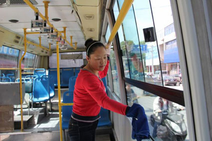而為了保持車廂內(nèi)的整潔,給乘客營(yíng)造溫馨的出行環(huán)境,黃傳霞付出了很多辛勞。當(dāng)車子到達(dá)終點(diǎn)站——公園東門(mén)時(shí),記者看到雖然只有幾分鐘的停歇時(shí)間,可黃傳霞卻沒(méi)有下車到站里休息,而是拿起拖把和抹布抓緊時(shí)間拖地、擦扶手和座椅。