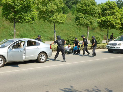 9時許,行動正式開始,總指揮接到市公安局指令稱,“犯罪嫌疑人”是兩名年約30-40歲的中年男子,駕駛一輛灰色無牌的小轎車往隧道方向駛來,現(xiàn)設(shè)點盤查進行抓捕,由交警對車輛進行檢查,同時刑警、特警配合攔截抓捕。任務(wù)分配后,交警首先在現(xiàn)場對車輛進行攔截,尤其是灰色無牌小轎車成為首選目標,9時5分,第一輛灰色小轎車被交警攔下,交警要求駕駛員熄火下車,提供“兩證”并打開后備廂,然后由特警配合進行檢查,大約檢查了20輛車后,9時15分,一輛灰色無牌小轎車駛?cè)肟c,可駕駛員并沒有按照交警的指示靠邊停車,反而是加大油門沖卡一直往南開去,這一異常舉動讓隨時待命的交警、特警及刑警覺得可疑,并通過手臺向隧道南段的特警通報進行攔截。9時18分,在離隧道200米的距離,這輛無牌小轎車被特警逼停,四名特警實槍荷彈地上前要求駕駛員熄滅下車,而駕駛員正在熄火的過程中,副駕駛位的另一名“犯罪嫌疑人”立刻開門往南跑去,另有三名特警迅速追上并當場制服逃跑的“犯罪嫌疑人”。這邊駕駛員則慢慢地下車,在全副武裝的特警面前也不敢輕舉妄動。9時20分,兩名“犯罪嫌疑人”被成功抓獲,特警也對車輛進行了全方位搜查。