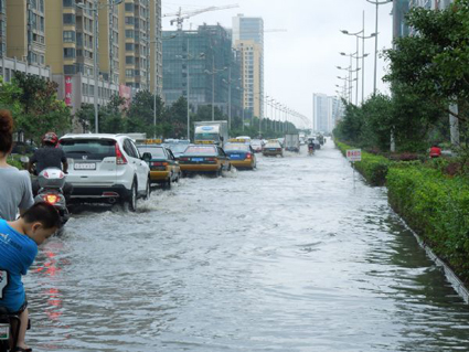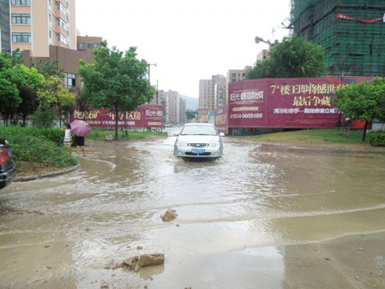 8時30分,在淮河新城小區(qū)內(nèi),由于暴雨的降臨,小區(qū)內(nèi)道路積滿了雨水,雨水不能及時排放,出行的居民踏著雨水行走在小區(qū)內(nèi),出門極為不便。