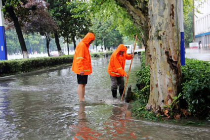 圖三:淮南市政管理處排污管理所的工作人員在積水路面疏通排水。