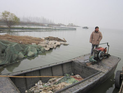 在高塘湖中,一道圍網(wǎng)將水面分開,一側(cè)屬于鳳陽縣管轄,另一側(cè)屬于淮南市管轄。王宗義指著水中的圍網(wǎng)告訴記者,當(dāng)時有3個人就拉著這些圍網(wǎng)才堅持等到救援。記者順著王宗義手指的方向看到,在離圍網(wǎng)約50米遠(yuǎn)的地方,就是沉船位置,一個把手高高地翹在水面上,船身已淹沒在水中。26日上午10點58分,在眾人的努力下,最后一具尸體終被找到。