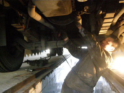 圖為淮南中北巴士公司三車隊(duì)技術(shù)人員鉆入車底檢修公交車底盤(pán)。