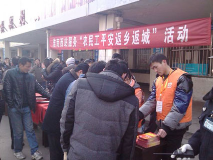 圖一:淮南西站工作人員開展“農(nóng)民工返鄉(xiāng)返城”活動(dòng)
