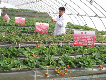 記者在市農(nóng)科所展示棚內(nèi)看到,各個(gè)草莓品種分區(qū)域種植,一改傳統(tǒng)的地面栽培而采用了高架栽培,茁壯的草莓苗中紅色的果實(shí)如瑪瑙點(diǎn)綴其中,一湊近,果香撲鼻。市農(nóng)科所副所長(zhǎng)張身嗣告訴記者,常規(guī)大田塑料棚中草莓在種植和采收時(shí),莓農(nóng)很是辛苦,彎腰屈身,極為疲勞。為改善作業(yè)環(huán)境,市農(nóng)科所草莓展示棚內(nèi)采用高架栽培模式,與傳統(tǒng)的地面栽培模式相比,定植、收獲時(shí)工人身體前屈的姿勢(shì)少了,站立姿勢(shì)多了,作業(yè)姿勢(shì)有了改善,疲勞大大減輕。因?yàn)閷?shí)行高架栽培,通風(fēng)透光條件好,有效抑制了草莓白粉病、灰霉病等病害的發(fā)生,掛在架子兩邊的草莓果實(shí)清潔衛(wèi)生,方便食用。