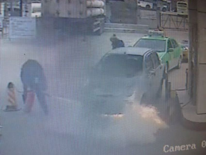 圖三:火苗迅速躥向加氣柜,形勢危急。(記者翻拍自加氣站監(jiān)控視頻)