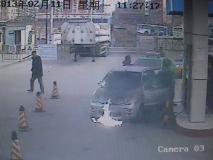 11點(diǎn)25分35秒:這輛小轎車加氣結(jié)束。這名中年男子先后蓋上了引擎蓋和后備箱,重新坐回駕駛室,準(zhǔn)備發(fā)動汽車。站在一旁的加氣員宋歡發(fā)現(xiàn),駕駛員在擰了三次鑰匙,仍然沒有將汽車引擎發(fā)動,駕駛員還在第四次重復(fù)著這樣的動作。小轎車后面緊跟著的車輛已經(jīng)離得很近,準(zhǔn)備在這輛小轎車開走之后進(jìn)行加氣。