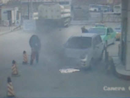 11點(diǎn)27分18秒:著火的小轎車前保險(xiǎn)杠位置開始冒出了黑煙,黑煙迅速濃烈起來。這時(shí),一直坐在駕駛室里的駕駛員打開車門,下車后立即跑開了。與此同時(shí),加氣站內(nèi)的人群開始四散跑開。另一名加氣員夏云大喊著疏散停在加氣站里的車輛,大約七八輛等待著加氣的車輛紛紛開始倒車,以最快的速度駛離加氣站。