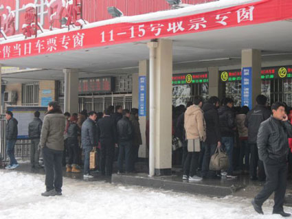 圖三:在淮南火車站,購票取票的旅客排成長隊。