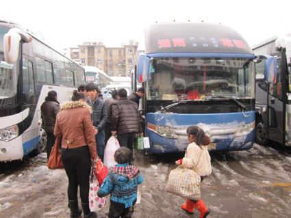 據介紹,淮南長途汽車站發(fā)車時間為早上5:30—下午5:30之間,由于19日受積雪影響,最早5:30的班車都向后推遲了約一個半小時,才允許發(fā)車。