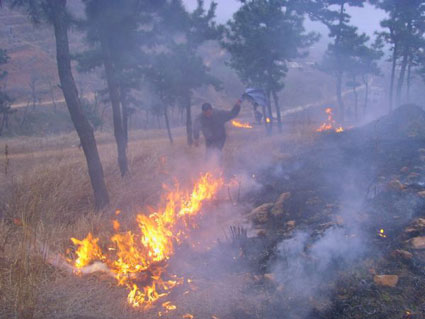 3月16日早晨,淮南中北巴士公司修理廠的10名黨員,乘車前往鳳臺縣茅仙洞景區(qū)游覽。上午8點15分左右,車行至鳳臺縣李沖回族自治鄉(xiāng)壽唐關(guān)時,大家決定下車徒步前往至茅仙洞。剛一下車,大家發(fā)現(xiàn),在100多米外的山坡上竄出火苗和濃煙,原本以為是當(dāng)?shù)氐拇迕駛冇幸鉄模茸呓艘院蟀l(fā)現(xiàn),著火現(xiàn)場只有一位年近古稀的老大爺,正望著瘋狂燃燒的草地自言自語,頓足失色。經(jīng)過詢問老人后得知,這大火并非有人點火燒荒所致,可能是有人玩火引發(fā)的。由于當(dāng)時山坡上風(fēng)力較大,火勢蔓延的速度很快,而且,火勢蔓延的方向,正好有一片較為密集的松樹林?吹嚼先耸肿銦o措的模樣,參與黨小組活動的支部委員沈樹毅急忙撥打消防報警電話,并指揮大家快步跑到著火現(xiàn)場。
