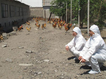 圖為淮南市財(cái)政、市畜牧局人員穿著防護(hù)服在原種場查看淮南麻黃雞種雞保種情況。