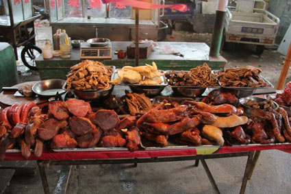 在我市舜耕農(nóng)貿(mào)市場(chǎng)內(nèi),記者一進(jìn)入市場(chǎng)就看到三四個(gè)出售熟食的攤位,這些鹵制好的熟食就裸露在攤位上,沒(méi)有任何的保鮮、防蠅和防塵的措施。由于是周六前來(lái)購(gòu)買(mǎi)的市民還是絡(luò)繹不絕!疤扉_(kāi)始熱起來(lái)了嘛,買(mǎi)點(diǎn)鹵菜下下酒!闭谝患沂焓硵傎(gòu)買(mǎi)鹵肉的一位男士說(shuō),這家鋪?zhàn)拥柠u肉口味很不錯(cuò),他經(jīng)常光顧。在該攤點(diǎn)前,記者觀察到,一些跟店主熟的顧客經(jīng)常徒手抓起幾個(gè)花生米或是鹵豆腐絲先嘗嘗鮮,還有一些顧客在購(gòu)買(mǎi)鹵菜的時(shí)候,明確要求自行挑選,于是便徒手伸進(jìn)裝菜的盆里左翻右翻,挑出自己感覺(jué)不錯(cuò)的鹵菜交給攤主過(guò)稱(chēng)。當(dāng)記者問(wèn)及該男士覺(jué)得這些熟食是否衛(wèi)生時(shí),他竟然毫不在意地回答道:“感覺(jué)還好吧,我經(jīng)常買(mǎi),也沒(méi)感覺(jué)什么不好的!庇浾唠S即又采訪了幾位來(lái)購(gòu)買(mǎi)的顧客,他們都表示,對(duì)所購(gòu)買(mǎi)菜品的衛(wèi)生狀況沒(méi)有多大要求。