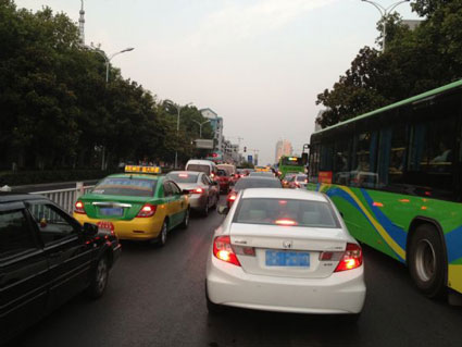 圖:在洞山大道與淮河大道北段十字路口,車輛排起長龍。