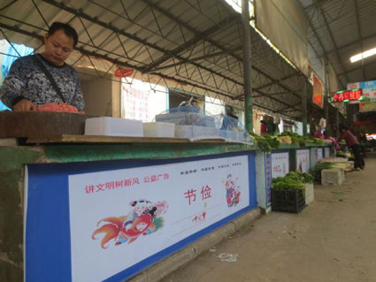 圖五:農(nóng)貿(mào)市場中,隨處可見“講文明樹新風”公益廣告宣傳畫。