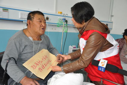 12月18日,一條微博《淮南愛(ài)心老人“義丐”謝傻子住院了!》在許多網(wǎng)友中間轉(zhuǎn)發(fā):“謝傻子”不僅在淮南家喻戶曉,他的名字更是走出了淮南,得到了更多人的關(guān)注和關(guān)愛(ài)。當(dāng)天,長(zhǎng)期幫扶老謝一家的淮南市紅十字會(huì)得知了消息,工作人員立即商討怎么幫助老謝。12月19日一早,要出差的市紅十字會(huì)秘書長(zhǎng)陳玉琴推遲了火車,帶著工作人員和志愿者來(lái)到了東方腫瘤醫(yī)院看望老謝。