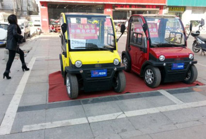 2013年12月31日,記者來到位于國慶中路與人民路交叉口北側(cè)的一家銷售電動四輪車的店鋪。在店鋪外,兩輛不同顏色的電動四輪車擺放在路邊。記者看到,展示的電動四輪車銷售價格近3萬元。
