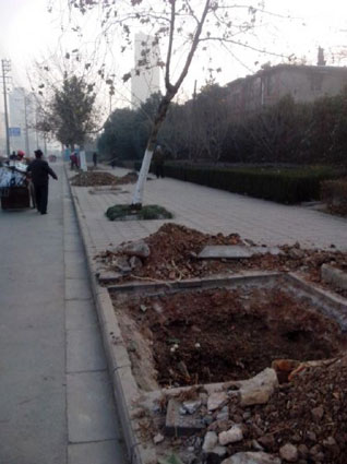 張師傅告訴記者,他是一家公司的駕駛員,因工作原因經(jīng)常要出差,1月6日上午,他剛從外地出差回來,發(fā)現(xiàn)小區(qū)北門前人行道上的大量樹木都不見了蹤影,“人行道上鋪的是方磚,方磚也被挖掉了不少,現(xiàn)在留下好多坑!睆垘煾捣Q,他詢問了多位小區(qū)居民,居民們稱這種情況已經(jīng)出現(xiàn)好多天,但無人清楚樹被誰挖走、被進(jìn)行了怎樣的處置……